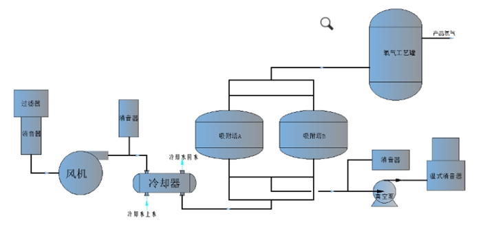 VPSA真空變壓吸附制氧工系統(tǒng)主要由鼓風(fēng)機(jī)、真空泵、切換閥、吸附塔和氧氣緩沖罐組成。原料空氣經(jīng)吸入口過(guò)濾器除掉灰塵顆粒后,被羅茨鼓風(fēng)機(jī)增壓后進(jìn)入其中一只吸附器內(nèi)。吸附器內(nèi)裝填吸附劑,其中水分、二氧化碳、及少量其它氣體組分在吸附器入口處被底部的活性氧化鋁所吸附,氮?dú)獗簧喜康姆惺肿雍Y所吸附。而氧氣(包括氬氣)為非吸附組分從吸附器頂部出口處作為產(chǎn)品氣排至氧氣緩沖罐。
